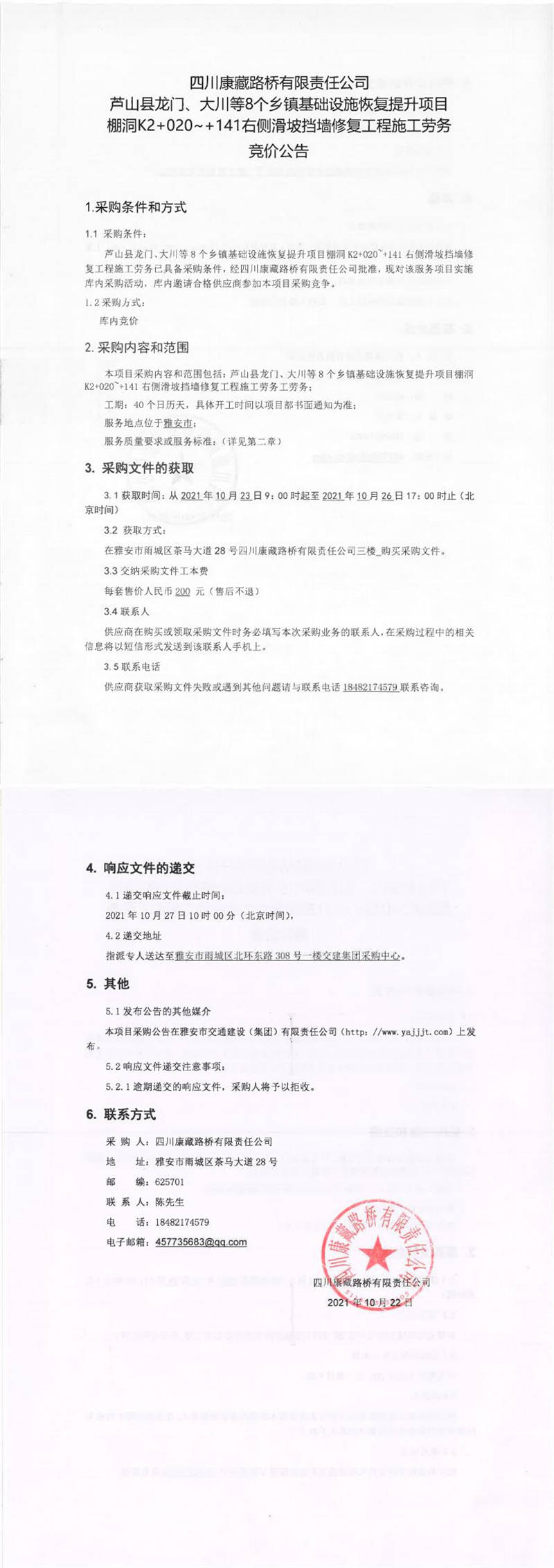 四川康藏路橋有限責(zé)任公司蘆山縣龍門、大川等8個鄉(xiāng)鎮(zhèn)基礎(chǔ)設(shè)施恢復(fù)提升項目棚洞K2+020~+141右側(cè)滑坡?lián)鯄π迯?fù)工程施工勞務(wù)采購競價公告