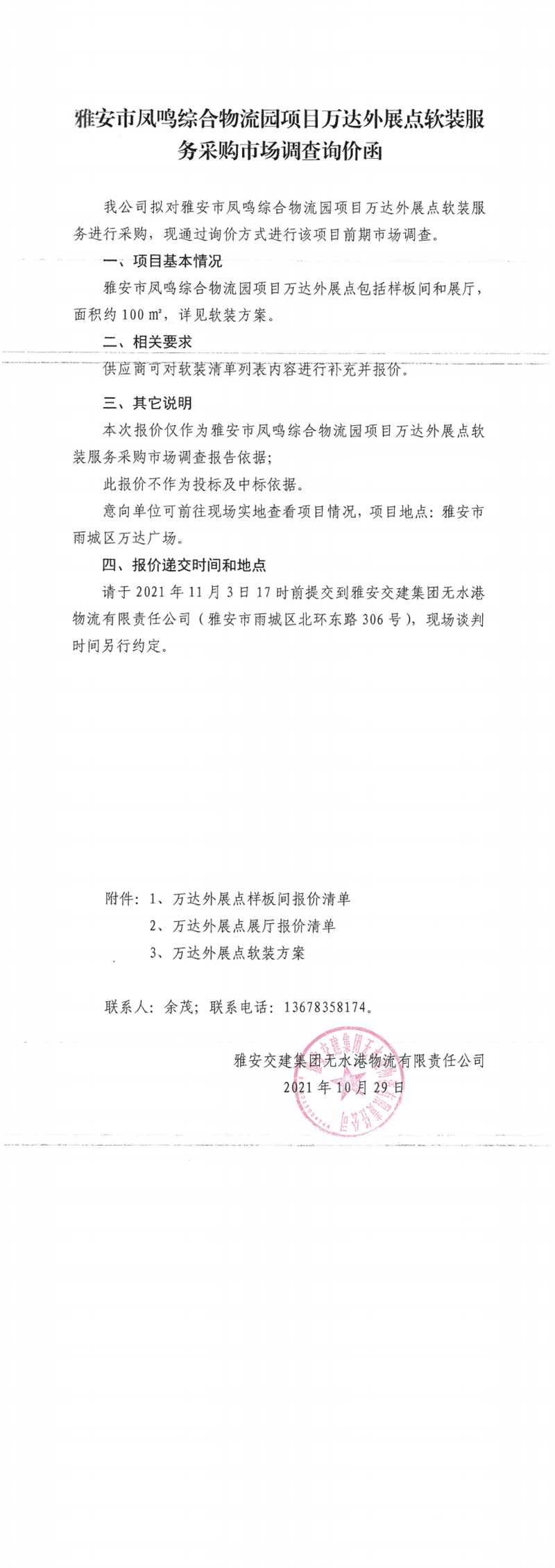 雅安交建集團(tuán)無水港物流有限責(zé)任公司雅安市鳳鳴綜合物流園項目萬達(dá)外展點(diǎn)軟裝服務(wù)采購市場調(diào)查詢價函