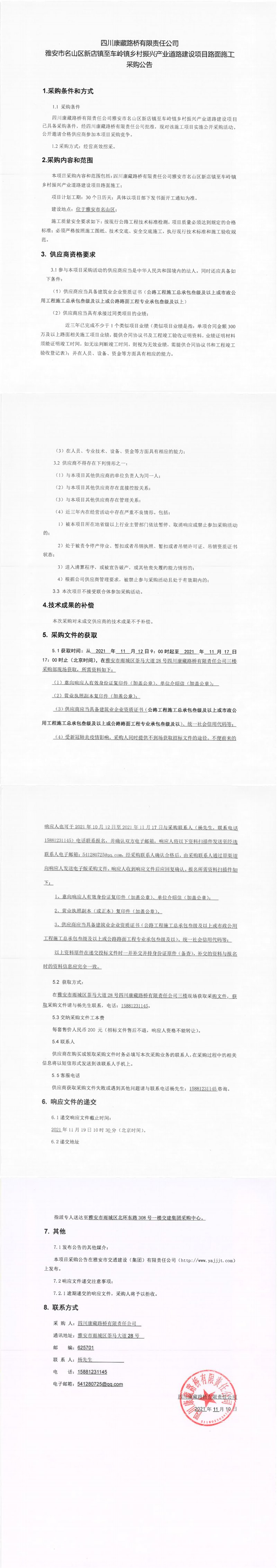 四川康藏路橋有限責(zé)任公司雅安市名山區(qū)新店鎮(zhèn)至車(chē)嶺鎮(zhèn)鄉(xiāng)村振興產(chǎn)業(yè)道路建設(shè)項(xiàng)目路面施工采購(gòu)公告