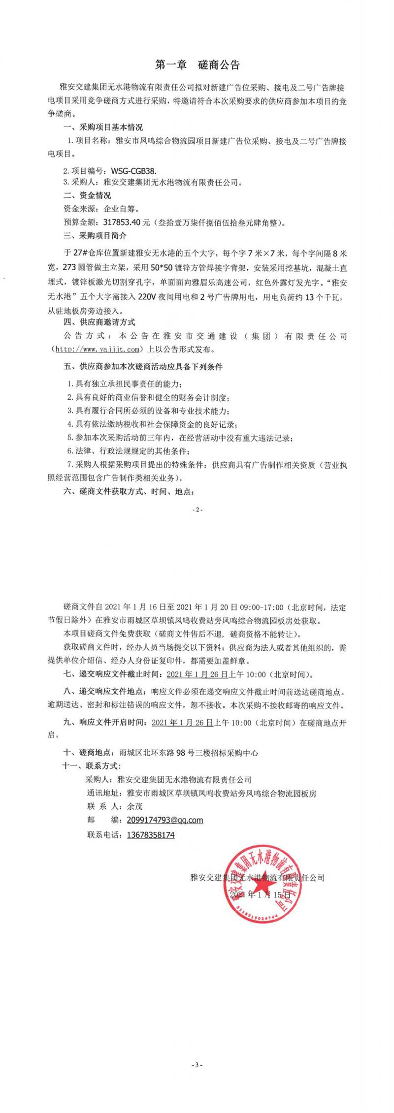 雅安交建集團無水港物流有限責(zé)任公司雅安市鳳鳴綜合物流園項目新建廣告位采購、接電及二號廣告牌接電項目磋商公告