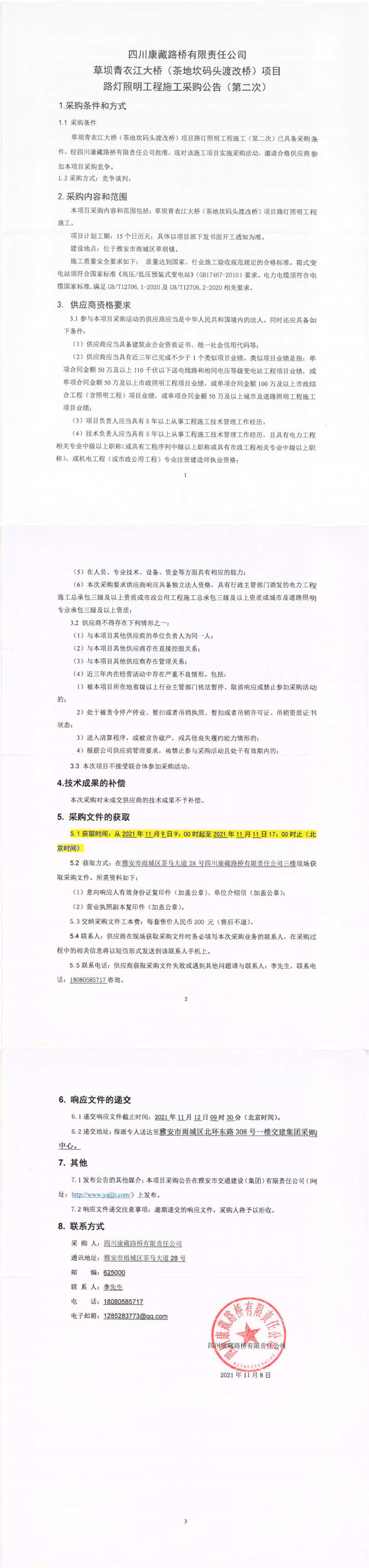 四川康藏路橋有限責(zé)任公司草壩青衣江大橋(茶地坎碼頭渡改橋)項(xiàng)目路燈照明工程施工采購公告(第二次)