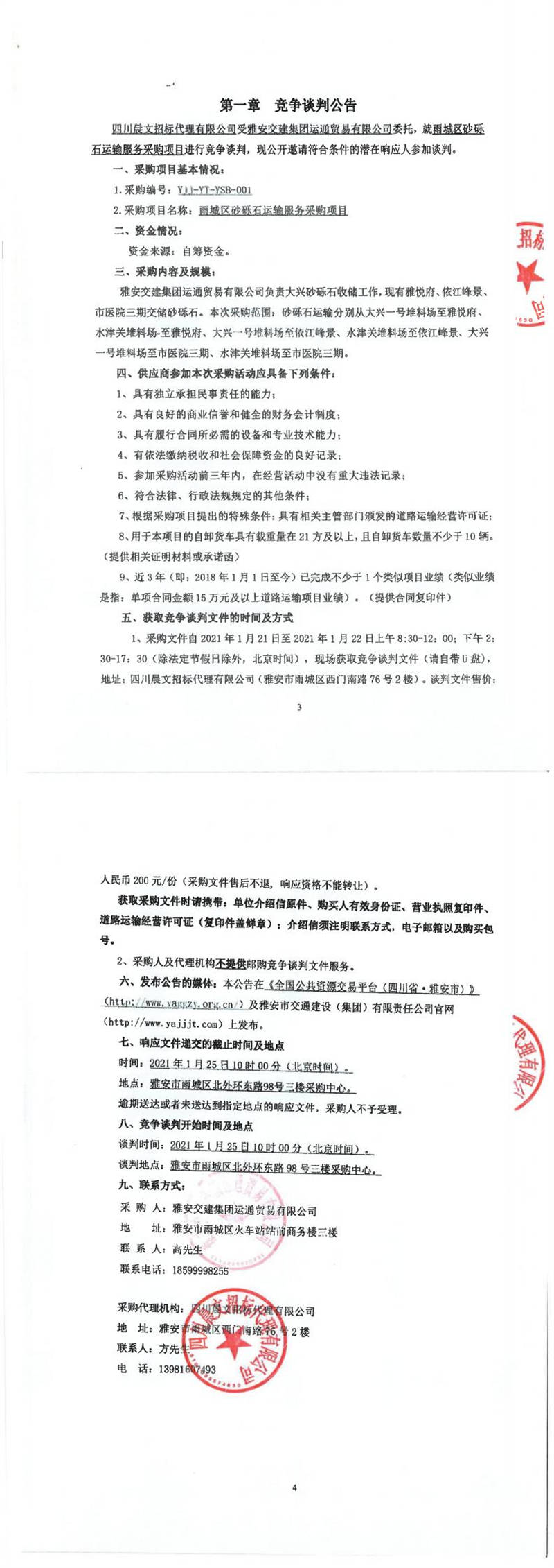 雅安交建集團運通貿(mào)易有限公司雨城區(qū)砂礫石運輸服務(wù)采購項目競爭談判公告