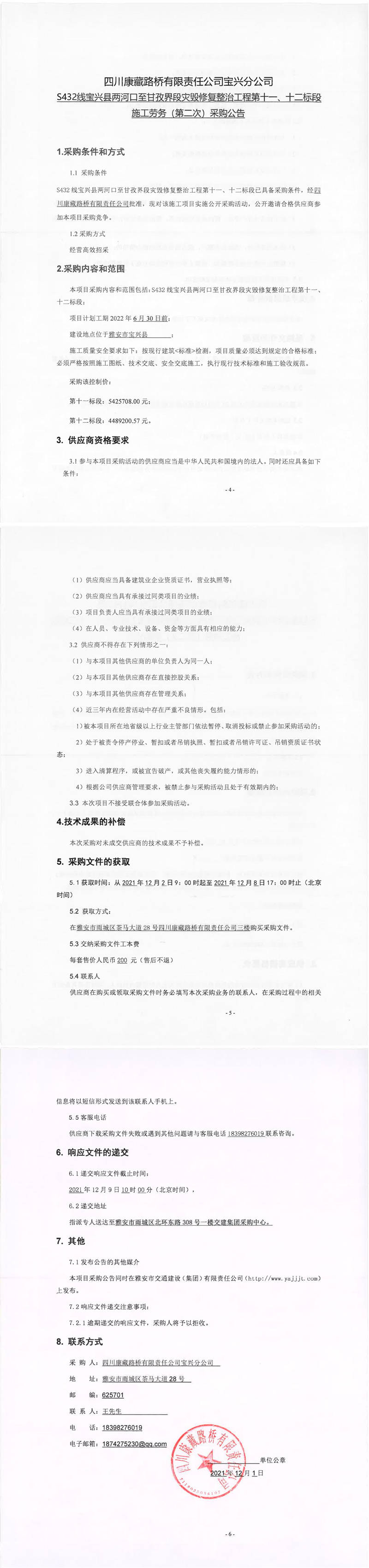四川康藏路橋有限責任公司S432線寶興縣兩河口至甘孜界段災毀修復整治工程第十一、十二標段施工勞務(第二次)采購公告