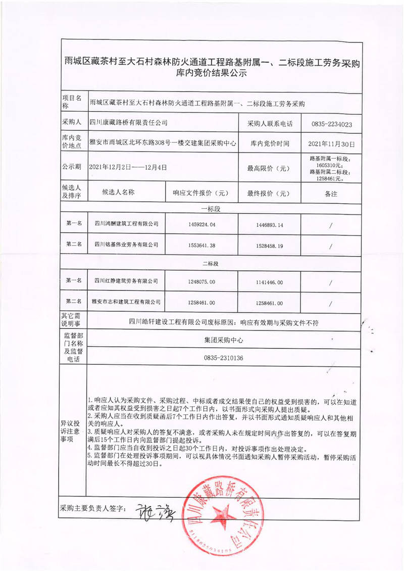 四川康藏路橋有限責(zé)任公司雨城區(qū)藏茶村至大石村森林防火通道工程路基附屬一、二標(biāo)段施工勞務(wù)采購庫內(nèi)競價(jià)結(jié)果公示