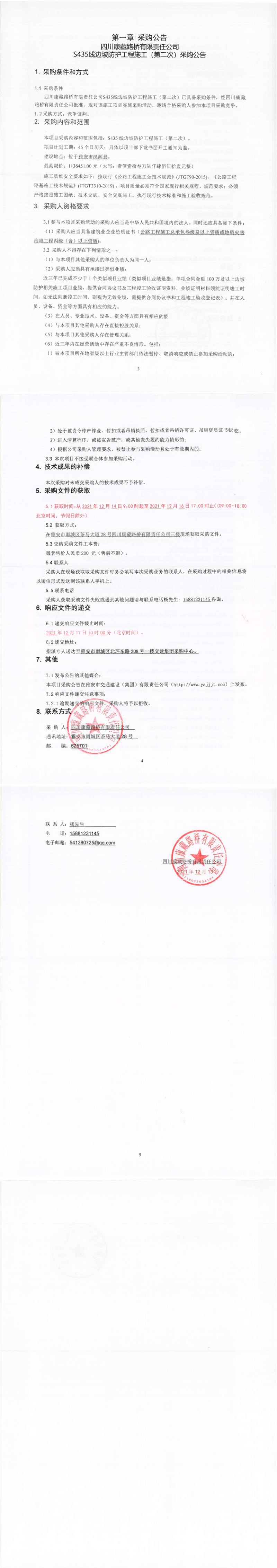 四川康藏路橋有限責(zé)任公司S435線邊坡防護(hù)工程施工(第二次)采購(gòu)公告