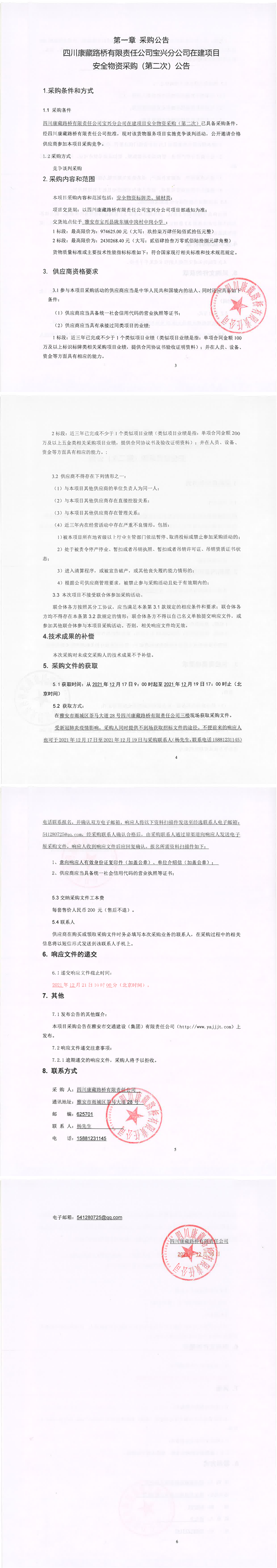 四川康藏路橋有限責任公司寶興分公司在建項目安全物資采購(第二次)公告