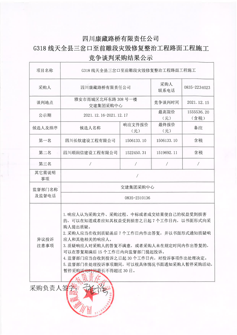 四川康藏路橋有限責任公司G318線天全縣三岔口至前碉段災毀修復整治工程路面工程施工競爭談判采購結果公示