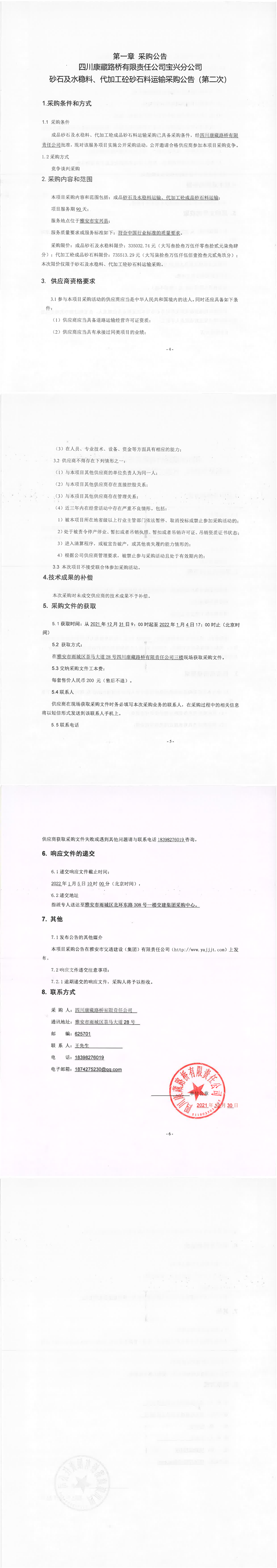 四川康藏路橋有限責(zé)任公司寶興分公司砂石及水穩(wěn)料、代加工砼砂石料運(yùn)輸采購公告(第二次)