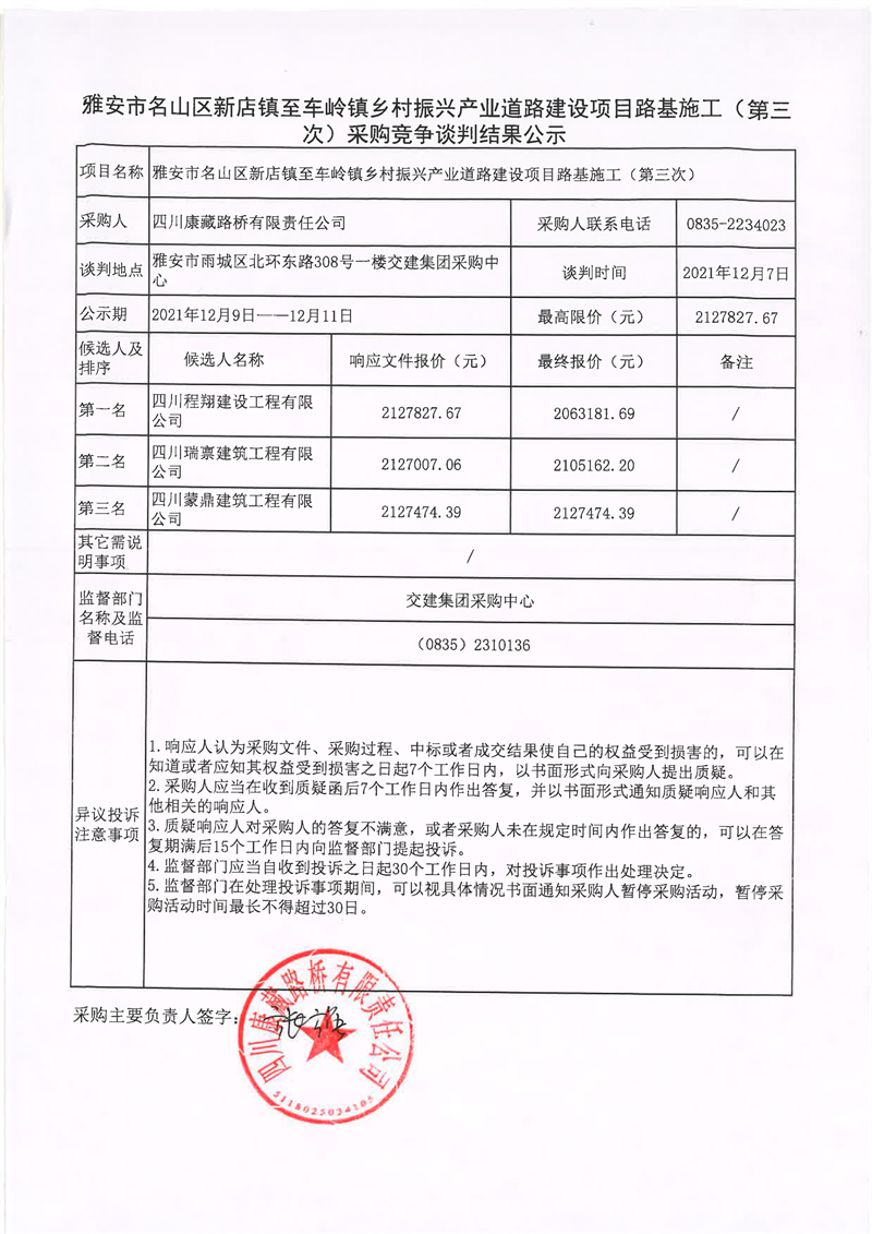 四川康藏路橋有限責(zé)任公司雅安市名山區(qū)新店鎮(zhèn)至車嶺鎮(zhèn)鄉(xiāng)村振興產(chǎn)業(yè)道路建設(shè)項(xiàng)目路基施工(第三次)采購競爭談判結(jié)果公示