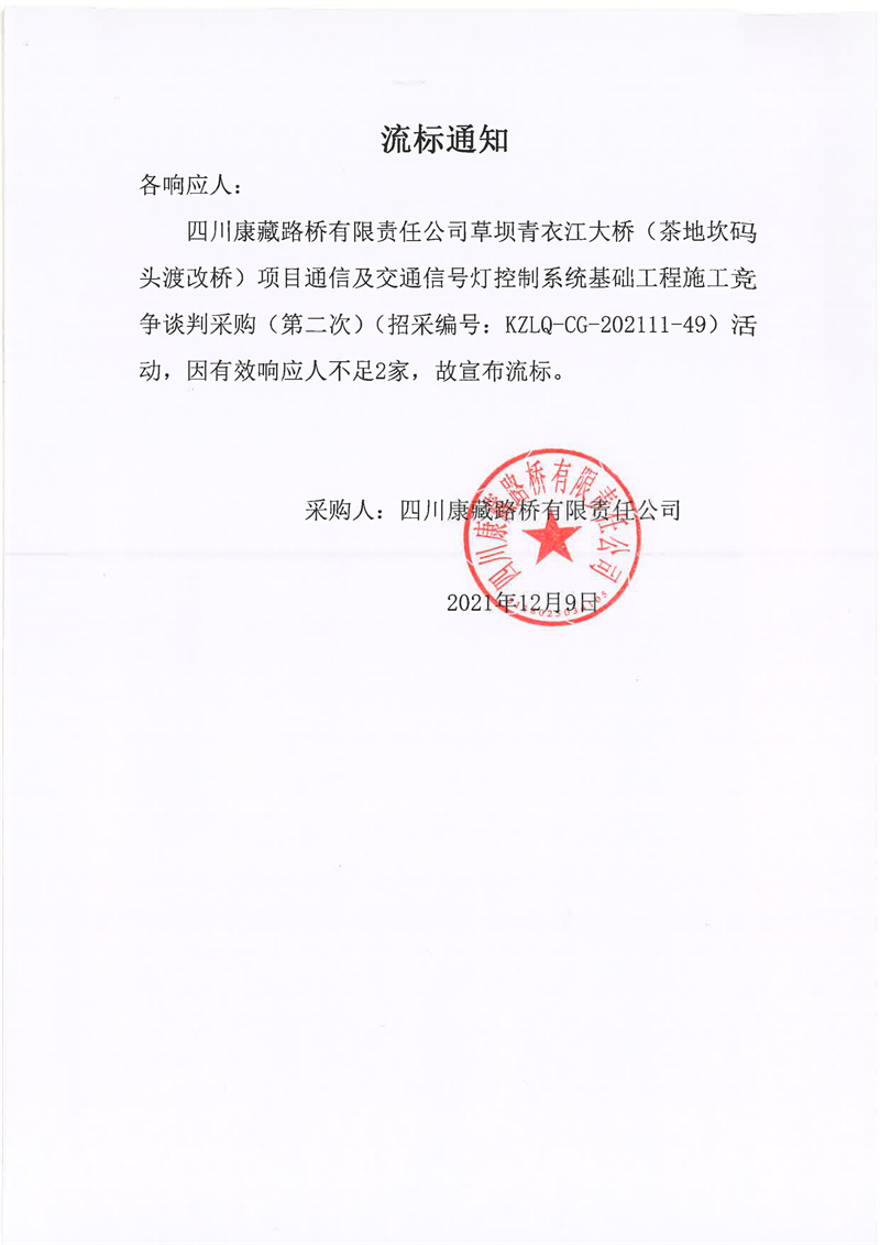 四川康藏路橋有限責(zé)任公司草壩青衣江大橋(茶地坎碼頭渡改橋)項(xiàng)目通信及交通信號(hào)燈控制系統(tǒng)基礎(chǔ)工程施工競(jìng)爭(zhēng)談判采購(gòu)(第二次)流標(biāo)通知