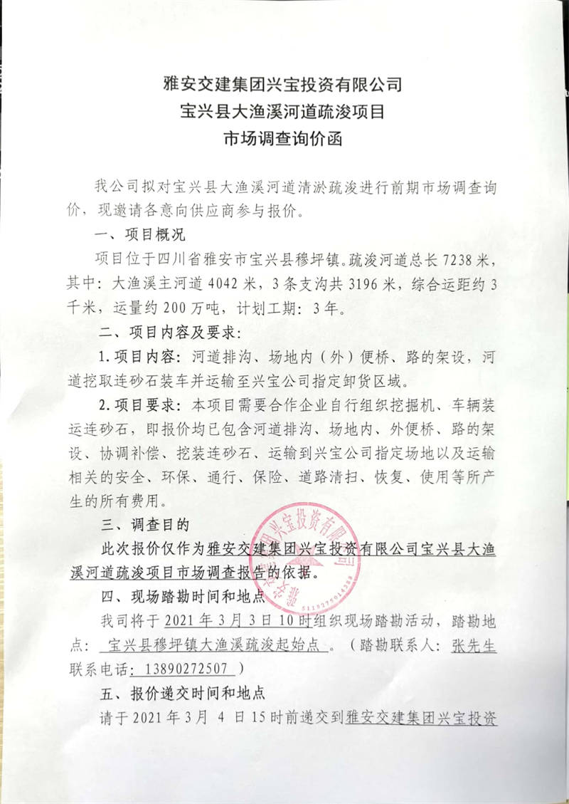 雅安交建集團興寶投資有限公司寶興縣大漁溪河道疏浚項目市場調(diào)查詢價公告