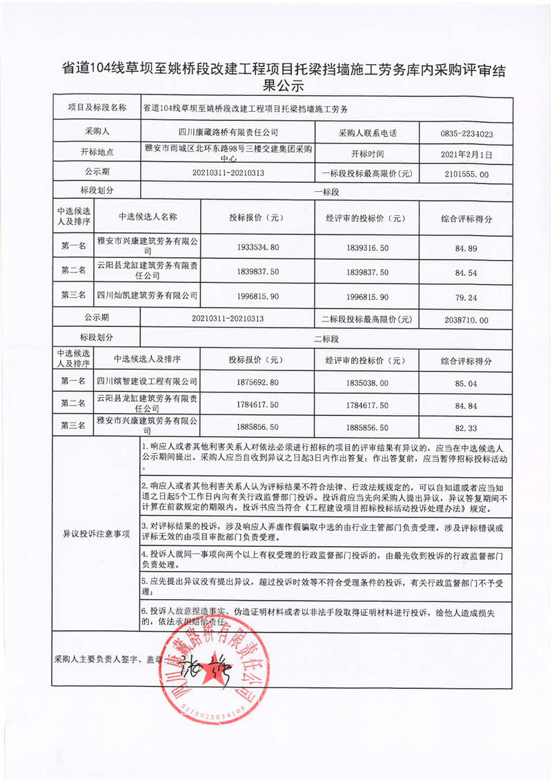 四川康藏路橋有限責(zé)任公司省道104線草壩至姚橋段改建工程項目托梁擋墻施工勞務(wù)庫內(nèi)采購評審結(jié)果公示