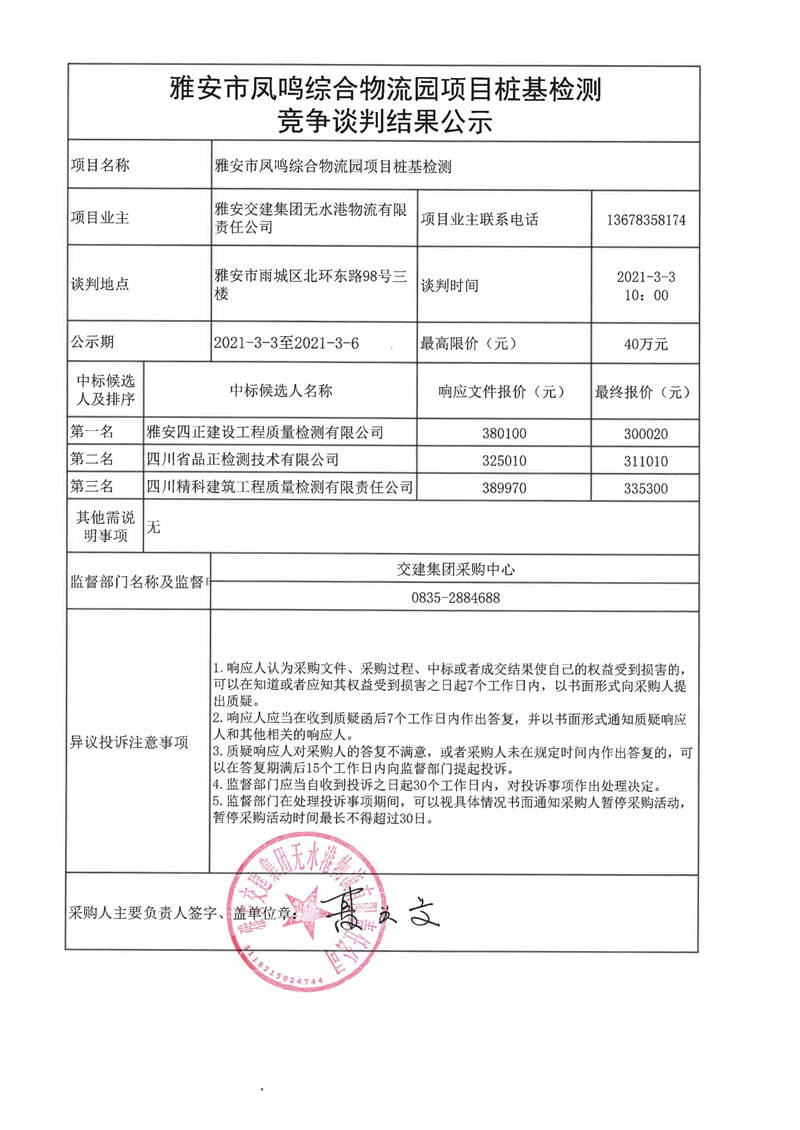 雅安交建集團(tuán)無水港物流有限責(zé)任公司雅安市鳳鳴綜合物流園項目樁基檢測競爭談判結(jié)果公示