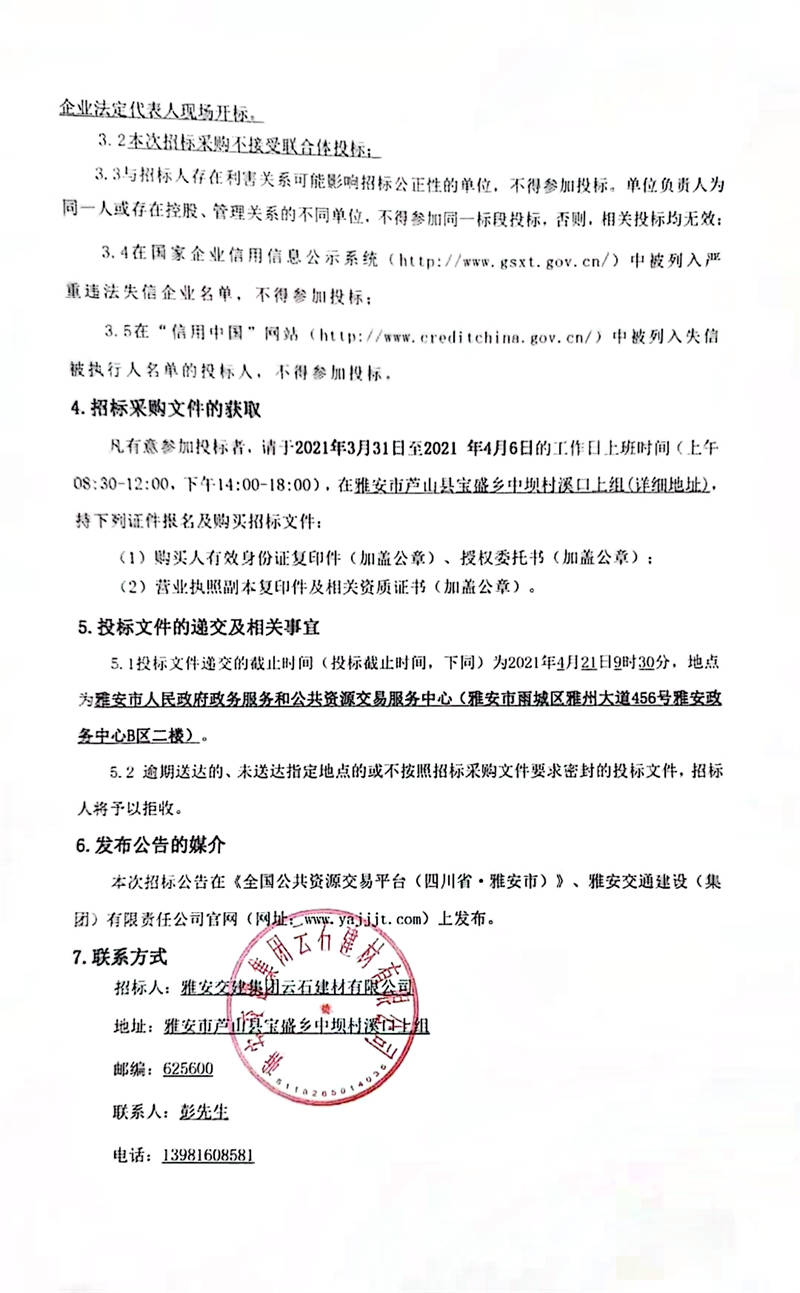 雅安交建集團(tuán)云石建材有限公司日產(chǎn)10000噸砂石骨料生產(chǎn)項(xiàng)目招標(biāo)采購公告