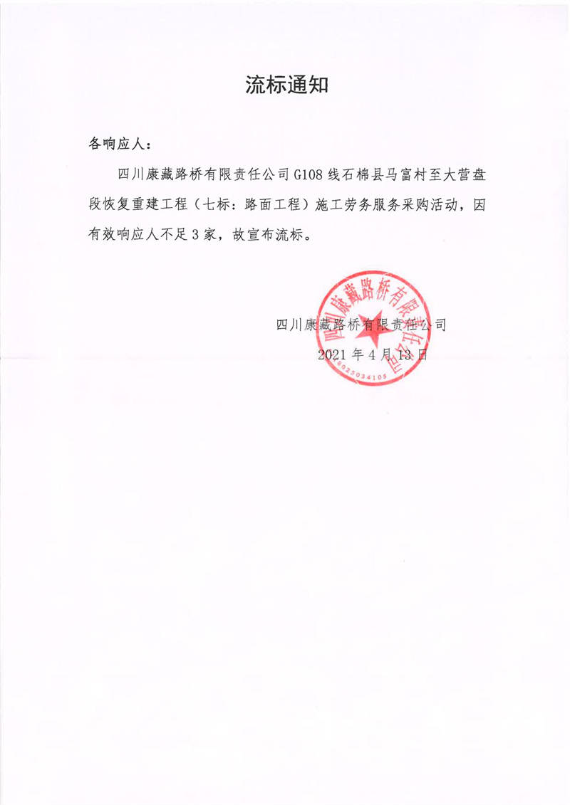 四川康藏路橋有限責(zé)任公司G108線石棉縣馬富村至大營(yíng)盤(pán)段恢復(fù)重建工程(七標(biāo):路面工程)施工勞務(wù)服務(wù)流標(biāo)通知