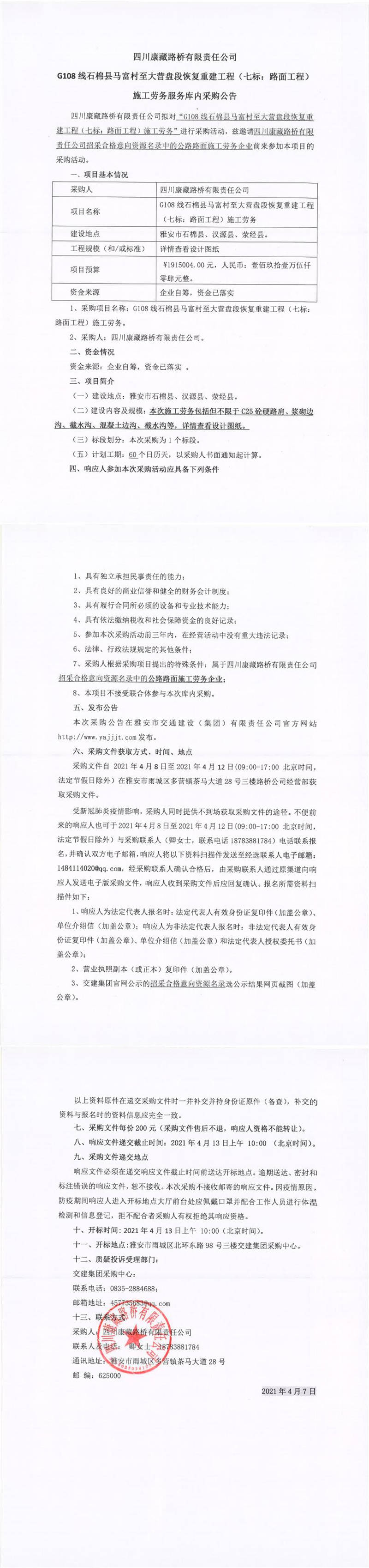 四川康藏路橋有限責(zé)任公司G108線石棉縣馬富村至大營盤段恢復(fù)重建工程(七標(biāo):路面工程)施工勞務(wù)服務(wù)庫內(nèi)采購公告