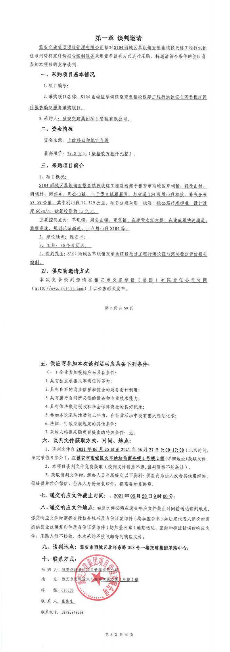 雅安交建集團(tuán)項目管理有限公司S104雨城區(qū)草壩鎮(zhèn)至望魚鎮(zhèn)段改建工程行洪論證與河勢穩(wěn)定評價報告編制服務(wù)采購項目競爭談判公告