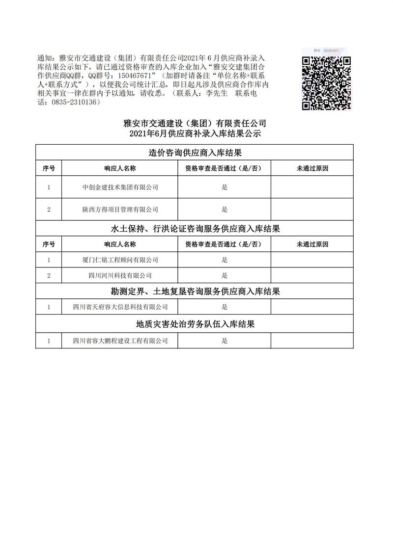 雅安市交通建設(shè)(集團(tuán))有限責(zé)任公司2021年6月供應(yīng)商補(bǔ)錄入庫結(jié)果公示