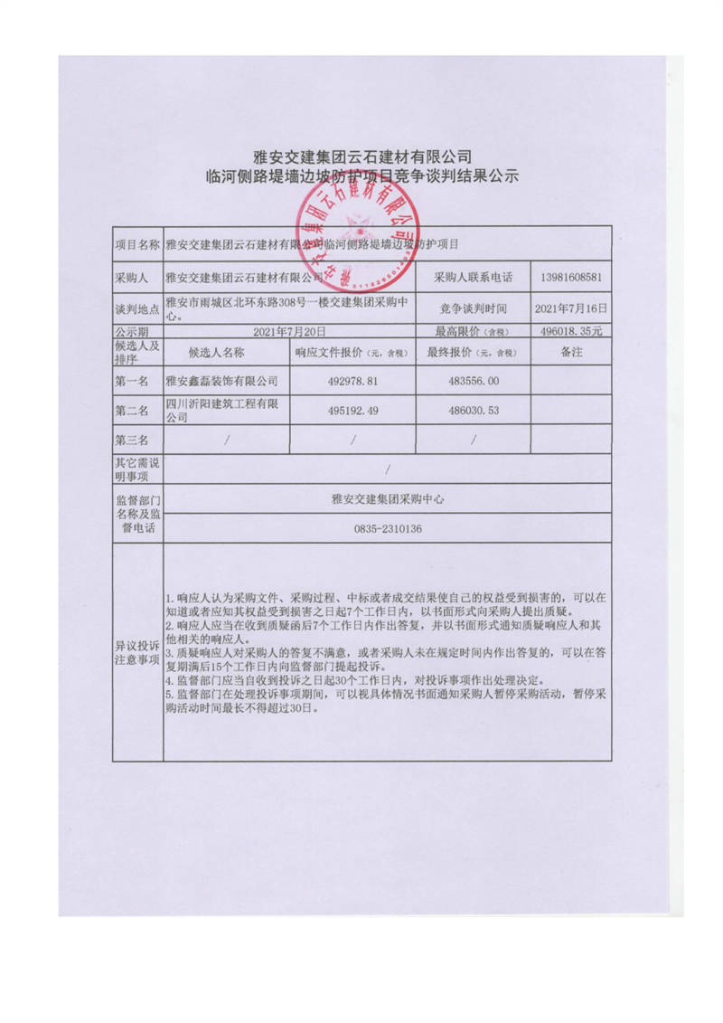 雅安交建集團(tuán)云石建材有限公司臨河側(cè)路堤墻邊坡防護(hù)項目競爭談判結(jié)果公示