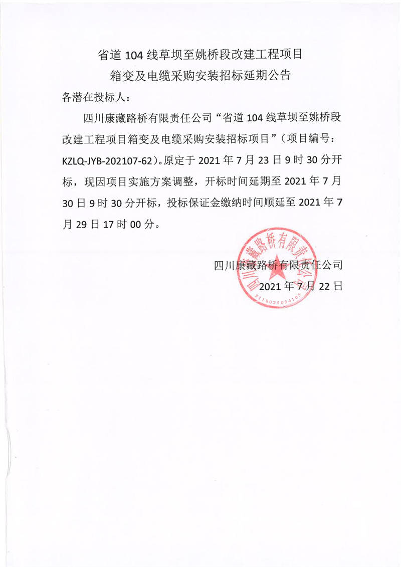 四川康藏路橋有限責任公司省道104線草壩至姚橋段改建項目箱變及電纜采購安裝招標延期公告