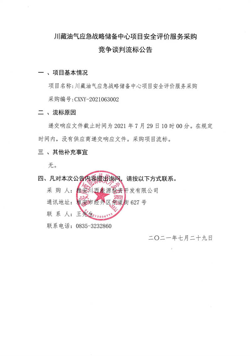 雅安川西能源投資開(kāi)發(fā)有限公司川藏油氣應(yīng)急戰(zhàn)略?xún)?chǔ)備中心項(xiàng)目安全評(píng)價(jià)服務(wù)采購(gòu)競(jìng)爭(zhēng)談判流標(biāo)公告
