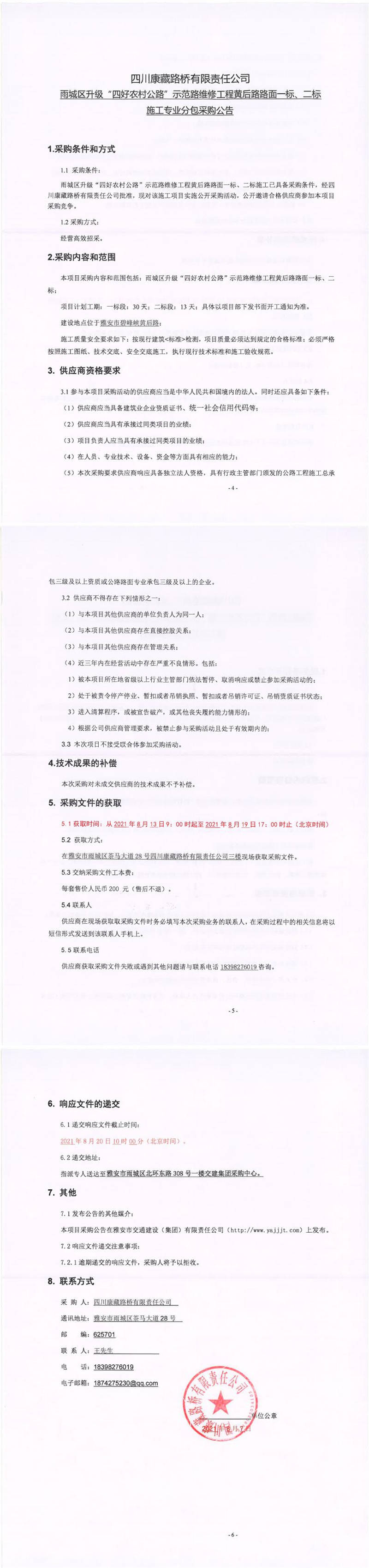 四川康藏路橋有限責(zé)任公司雨城區(qū)升級(jí)“四好農(nóng)材公路”示范路維修工程黃后路路面一標(biāo)、二標(biāo)施工專業(yè)分包采購(gòu)公告