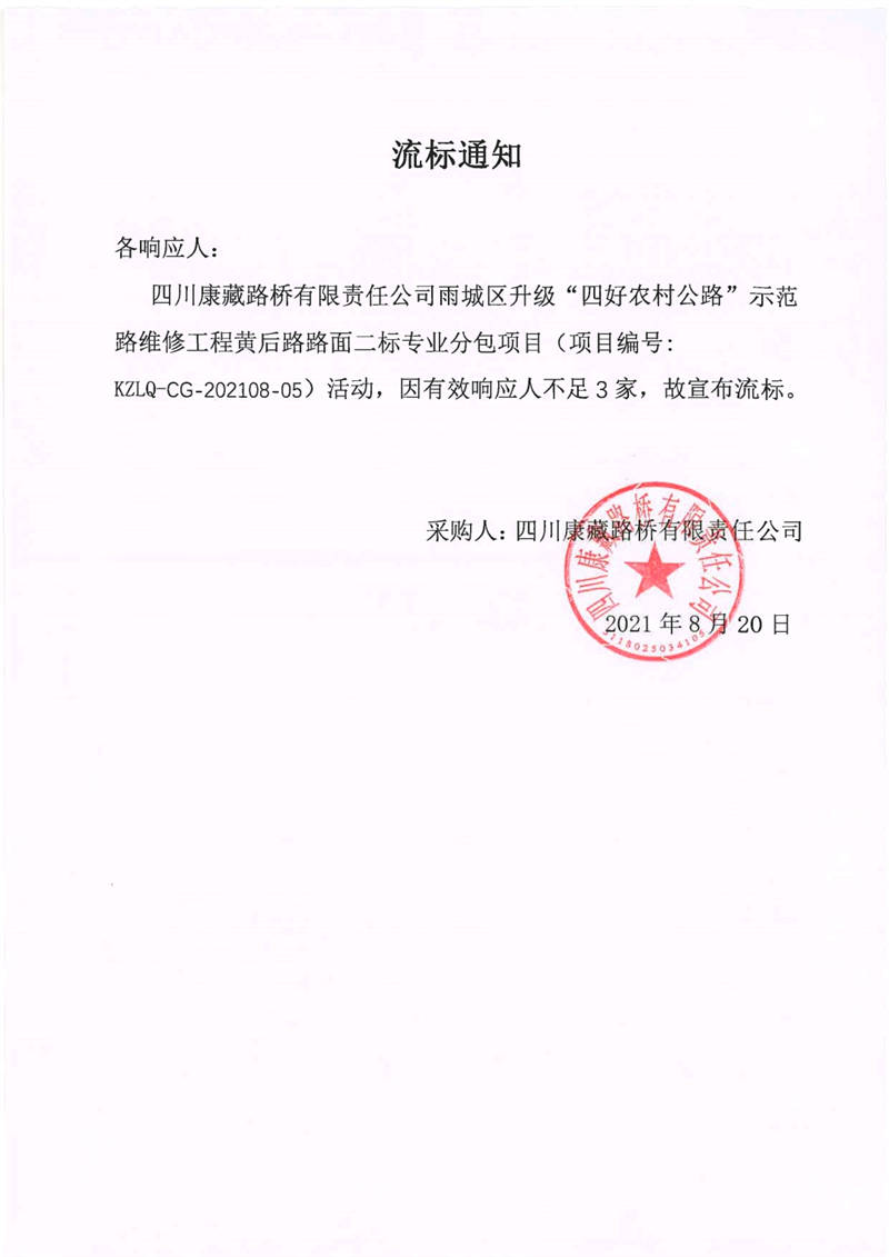 四川康藏路橋有限責(zé)任公司雨城區(qū)升級(jí)“四好農(nóng)村公路”示范路維修工程黃后路路面二標(biāo)專業(yè)分包項(xiàng)目流標(biāo)通知