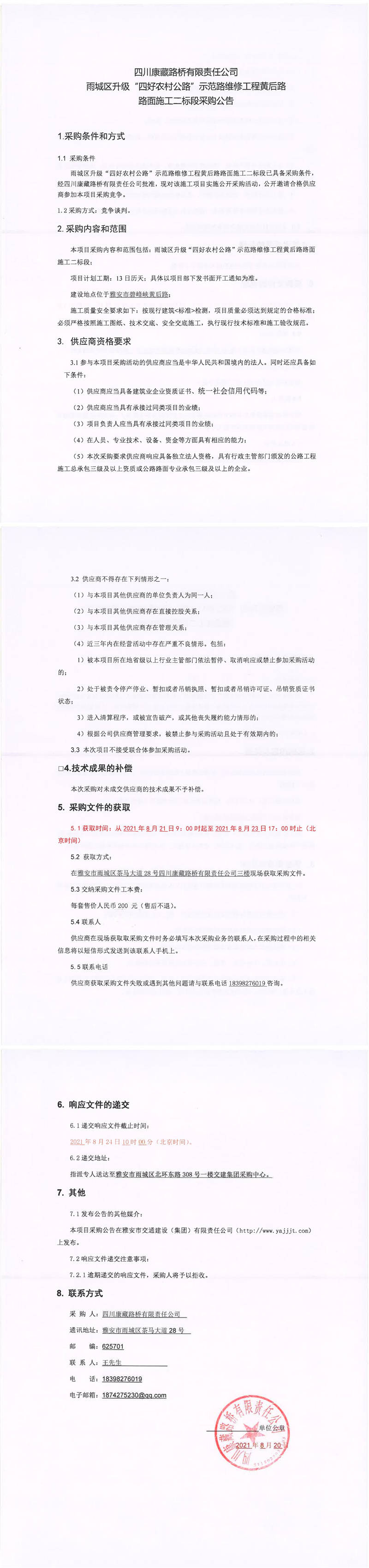 四川康藏路橋有限責(zé)任公司雨城區(qū)升級“四好農(nóng)村公路”示范路維修工程黃后路路面施工二標段采購公告
