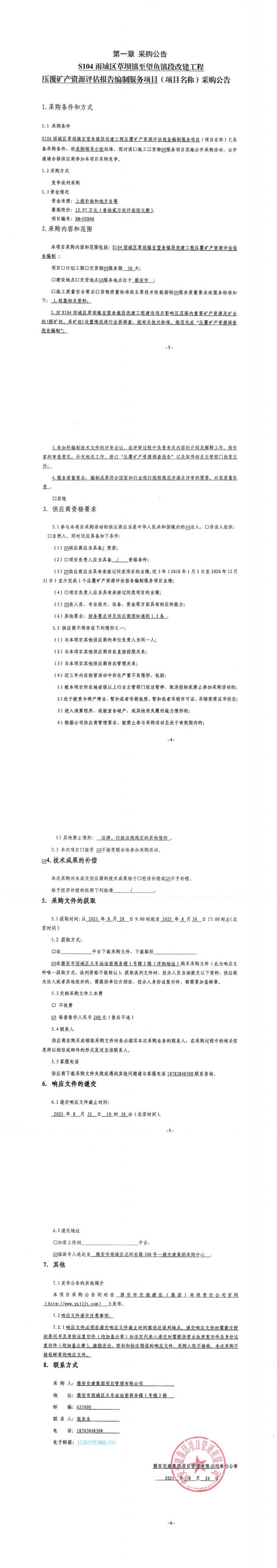 雅安交建集團(tuán)項(xiàng)目管理有限公司S104雨城區(qū)草壩鎮(zhèn)至望魚(yú)鎮(zhèn)段改建工程壓覆礦產(chǎn)資源評(píng)估報(bào)告編制服務(wù)項(xiàng)目采購(gòu)公告