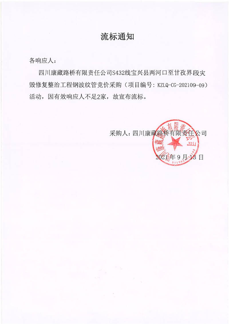 四川康藏路橋有限責(zé)任公司S432線寶興縣兩河口至甘孜界段災(zāi)毀修復(fù)整治工程鋼波紋管競價采購流標(biāo)通知