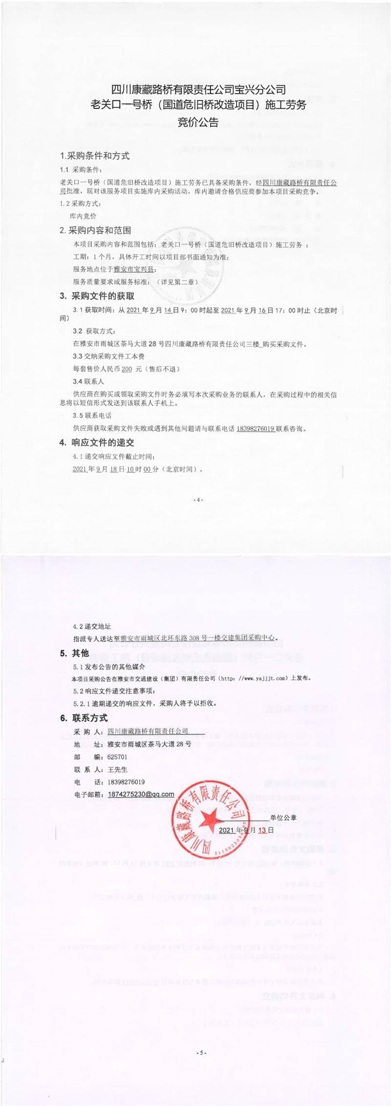 四川康藏路橋有限責任公司寶興分公司老關(guān)口一號橋(國道危舊橋改造項目)施工勞務(wù)競價公告