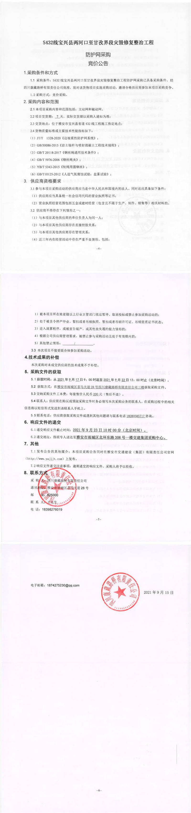 四川康藏路橋有限責任公司S432線寶興縣兩河口至甘孜界段災毀修復整治工程防護網(wǎng)采購競價公告
