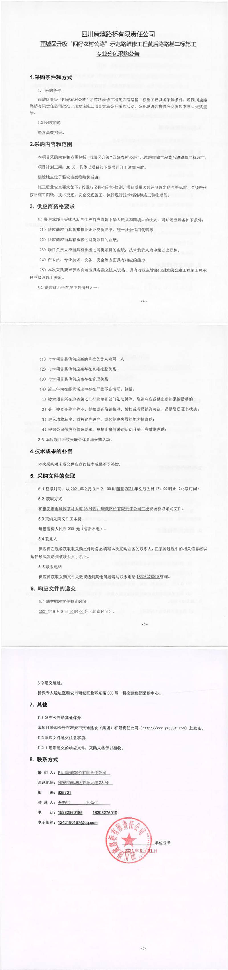 四川康藏路橋有限責(zé)任公司雨城區(qū)升級“四好農(nóng)村公路”示范路維修工程黃后路路基二標施工專業(yè)分包采購公告