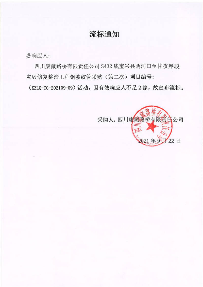 四川康藏路橋有限責(zé)任公司S432線寶興縣兩河口至甘孜界段災(zāi)毀修復(fù)整治工程鋼波紋管采購(第二次)流標(biāo)通知