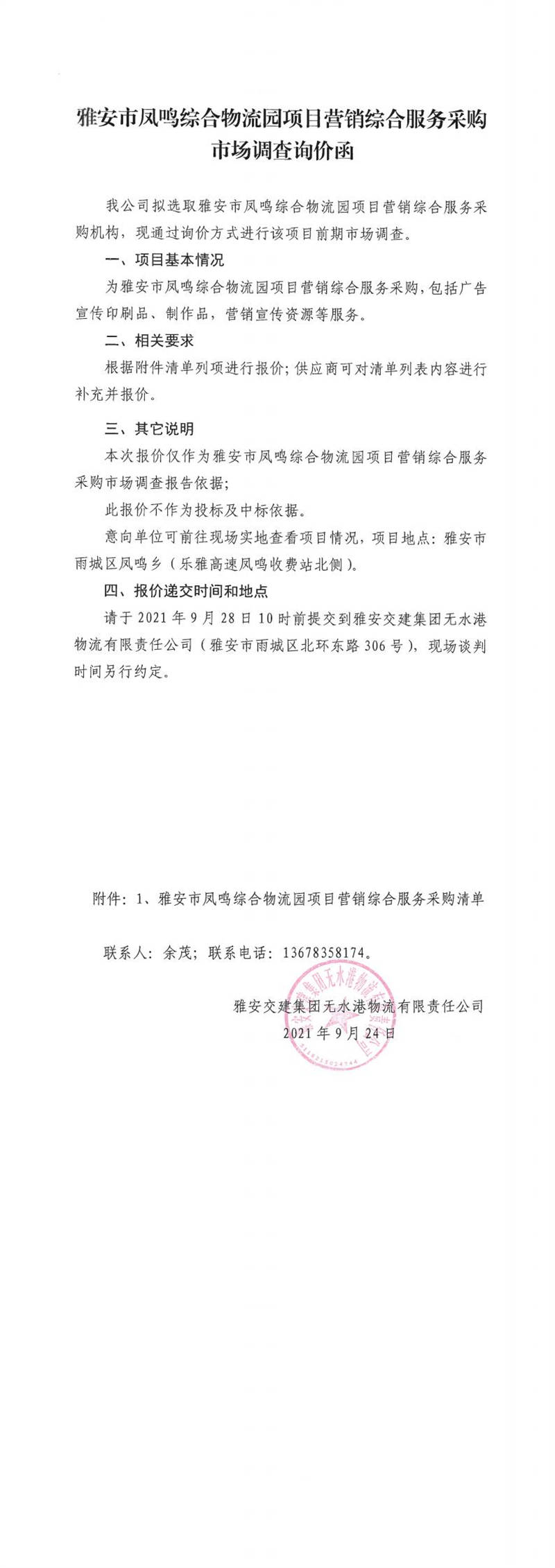 雅安交建集團無水港物流有限責任公司雅安市鳳鳴綜合物流園項目營銷綜合服務采購市場調(diào)查詢價函