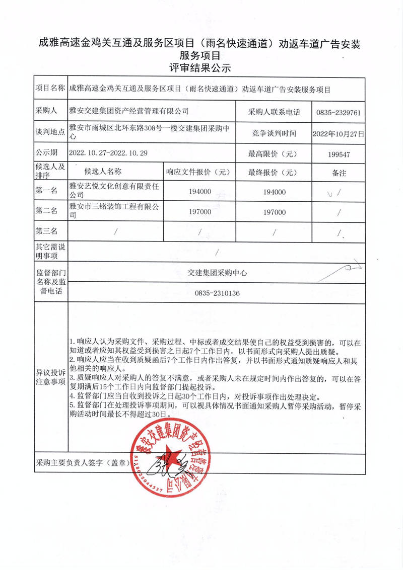 雅安交建集團(tuán)資產(chǎn)經(jīng)營管理有限公司成雅高速金雞關(guān)互通及服務(wù)區(qū)項(xiàng)目(雨名快速通道)勸返車道廣告安裝服務(wù)項(xiàng)目評(píng)審結(jié)果公示