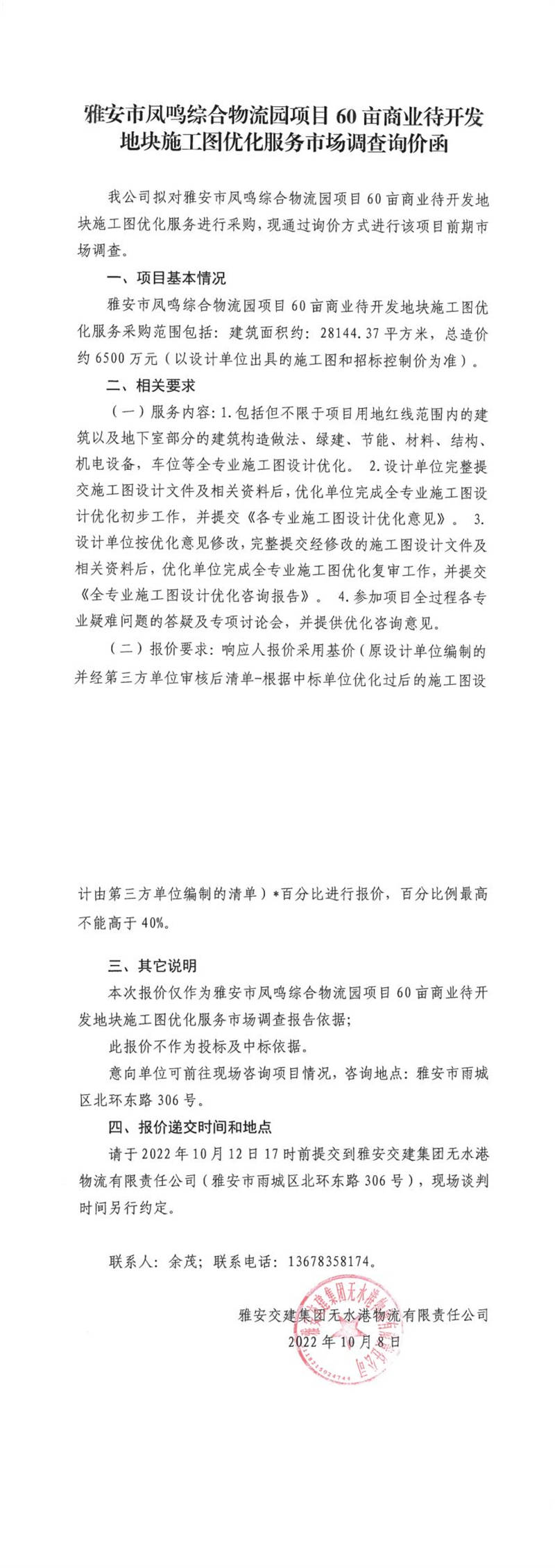 雅安交建集團無水港物流有限責(zé)任公司雅安市鳳鳴綜合物流園項目60畝商業(yè)待開發(fā)地塊施工圖優(yōu)化服務(wù)市場調(diào)查詢價函