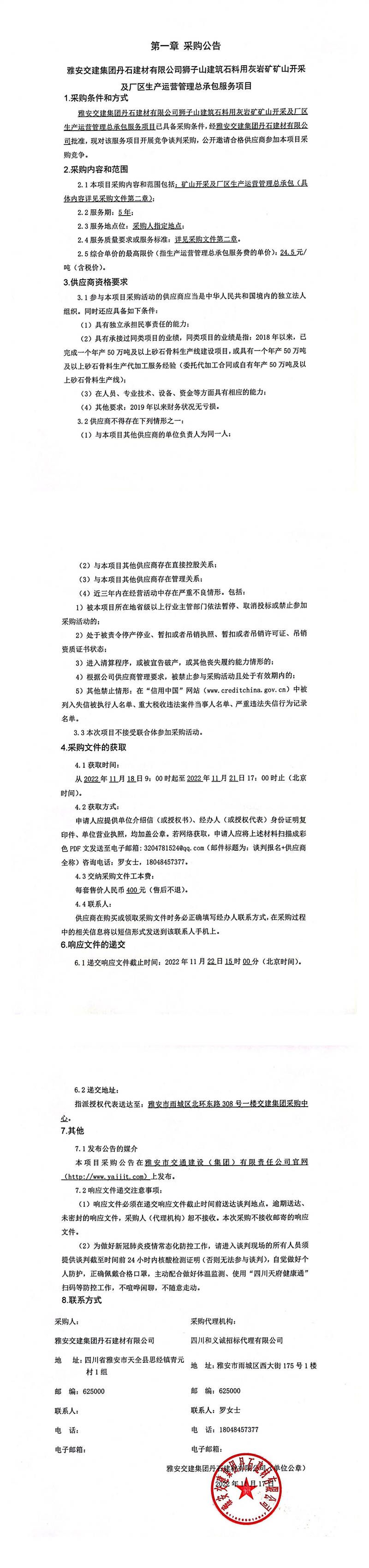 雅安交建集團(tuán)丹石建材有限公司獅子山建筑石料用灰?guī)r礦礦山開采及廠區(qū)生產(chǎn)運(yùn)營管理總承包服務(wù)項(xiàng)目采購公告