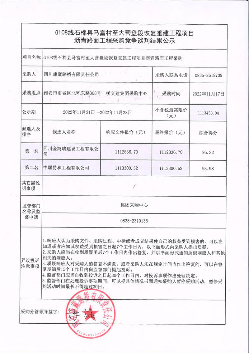 四川康藏路橋有限責任公司G108線石棉縣馬富村至大營盤段恢復重建工程項目瀝青路面工程采購競爭談判結(jié)果公示