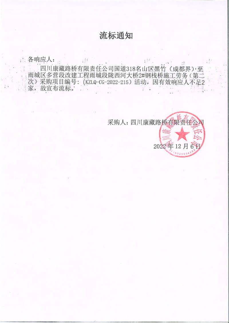 四川康藏路橋有限責(zé)任公司國道318名山區(qū)黑竹(成都界)至雨城區(qū)多營段改建工程雨城段隴西河大橋2#鋼棧橋施工勞務(wù)(第二次)采購項目流標(biāo)通知