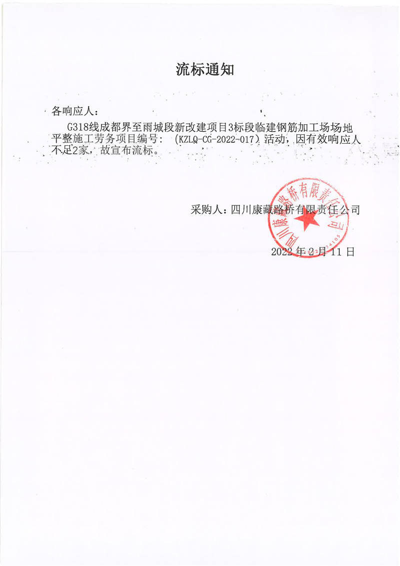 四川康藏路橋有限責任公司G318線成都界至雨城段新改建項目3標段臨建鋼筋加工場場地平整施工勞務(wù)項目流標通知