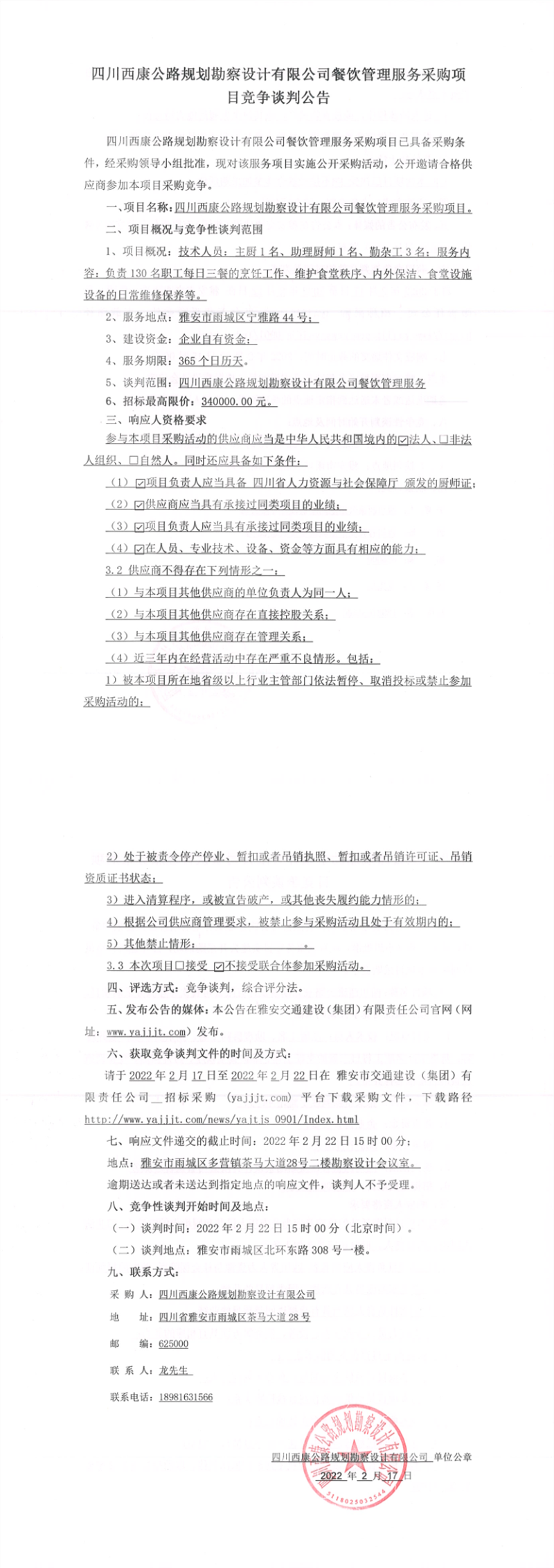 四川西康公路規(guī)劃勘察設(shè)計(jì)有限公司餐飲管理服務(wù)采購(gòu)項(xiàng)目競(jìng)爭(zhēng)談判公告