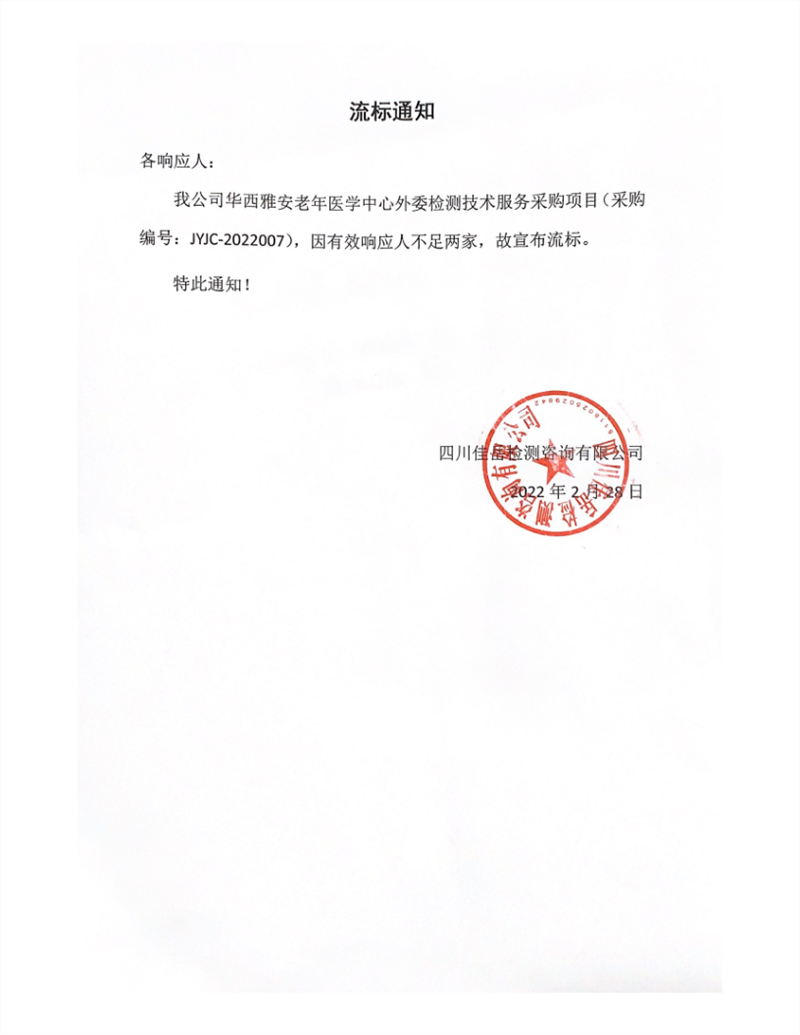 四川佳岳檢測咨詢有限公司華西雅安老年醫(yī)學(xué)中心外委檢測技術(shù)服務(wù)采購項(xiàng)目流標(biāo)通知