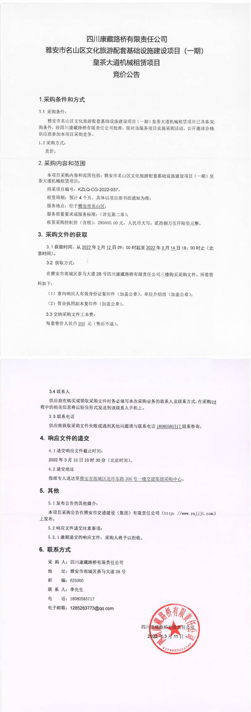 四川康藏路橋有限責任公司雅安市名山區(qū)文化旅游配套基礎設施建設項目(一期)皇茶大道機械租賃項目競價公告