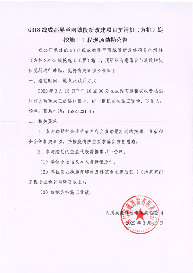 四川康藏路橋有限責(zé)任公司G318線成都界至雨城段新改建項目抗滑樁(方樁)旋挖施工工程現(xiàn)場踏勘公告
