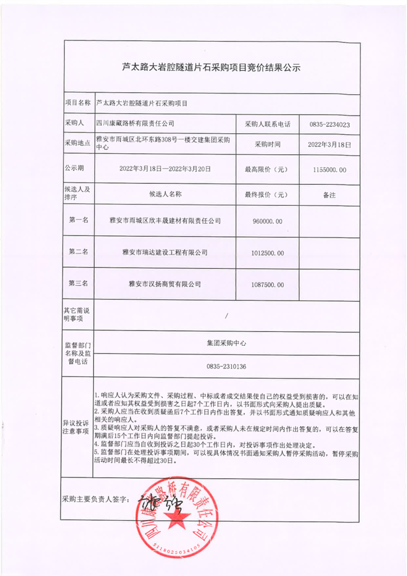 四川康藏路橋有限責(zé)任公司蘆太路大巖腔隧道片石采購(gòu)項(xiàng)目競(jìng)價(jià)結(jié)果公示