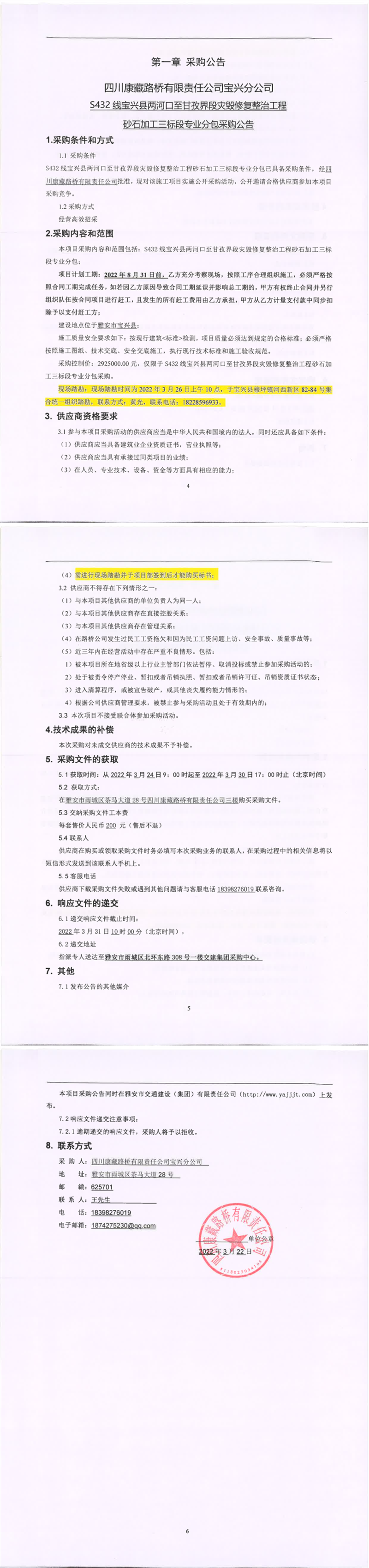 四川康藏路橋有限責(zé)任公司S432線寶興縣兩河口至甘孜界段災(zāi)毀修復(fù)整治工程砂石加工三標(biāo)段專業(yè)分包采購(gòu)公告