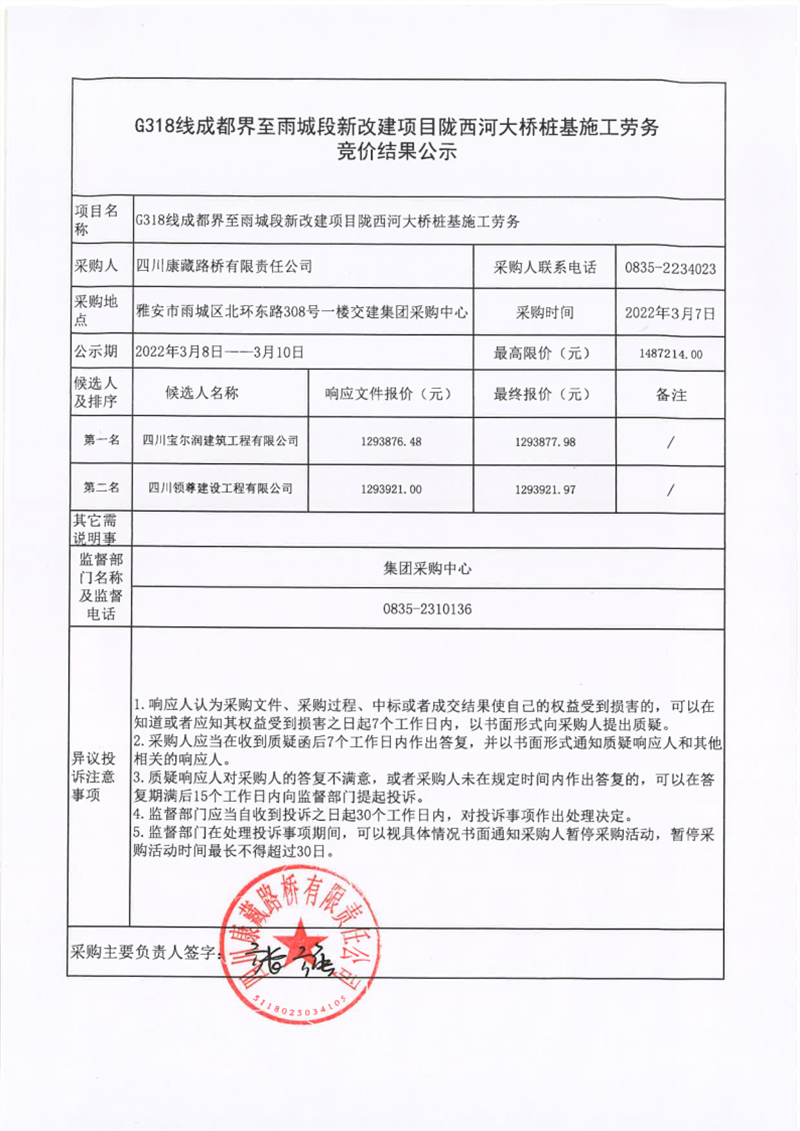 四川康藏路橋有限責(zé)任公司G318線成都界至雨城段新改建項(xiàng)目隴西河大橋樁基施工勞務(wù)競價(jià)結(jié)果公示