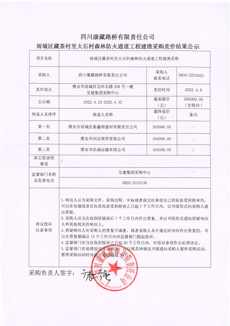 四川康藏路橋有限責(zé)任公司雨城區(qū)藏茶村至大石村森林防火通道工程建渣采購競價結(jié)果公示