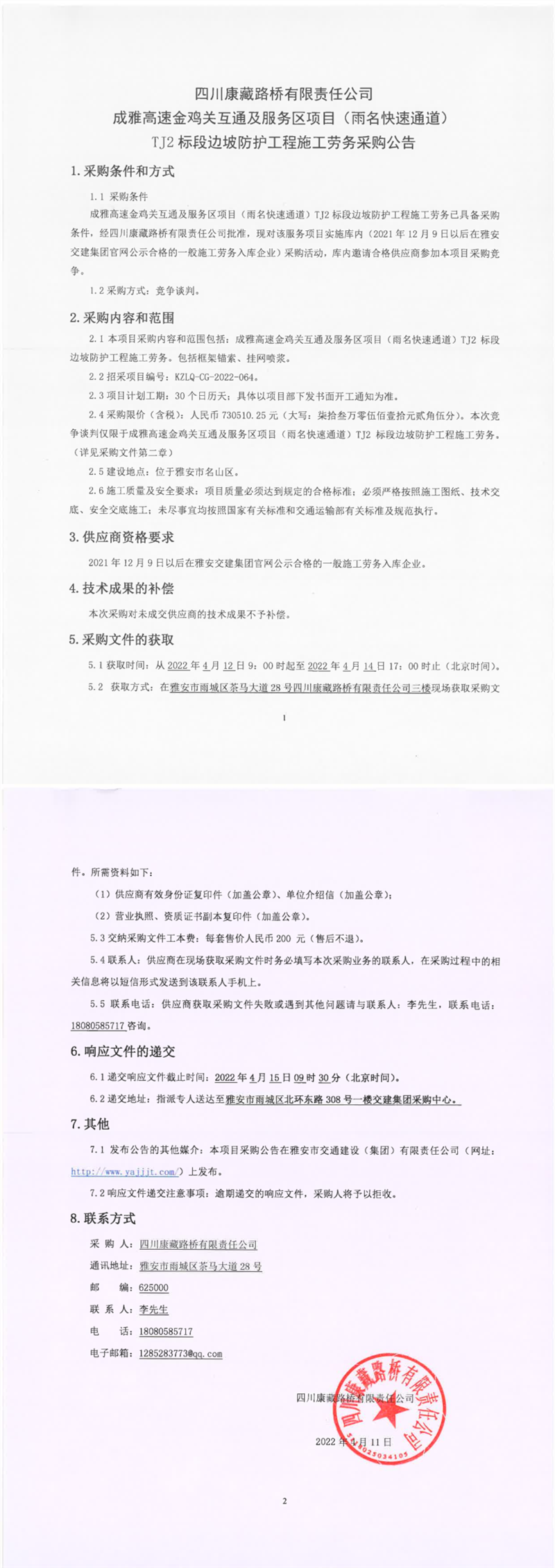 四川康藏路橋有限責(zé)任公司成雅高速金雞關(guān)互通及服務(wù)區(qū)項(xiàng)目(雨名快速通道)TJ2標(biāo)段邊坡防護(hù)工程施工勞務(wù)采購(gòu)公告